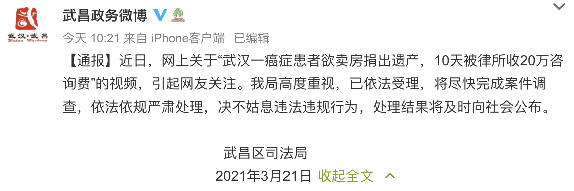 近日,湖北武汉。癌症晚期患者艾女士反映:考虑生命无多,打算卖房后捐给动物协会。咨询律师时,10天时间被律师事务所收取了20万元咨询费。目前,艾女士已向武昌区司法局投诉了该律师事务所。21日,武昌区司法局回应,已依法受理,并将尽快完成案件调查,依法依规严肃处理,决不姑息违法违规行为,处理结果将及时向社会公布。