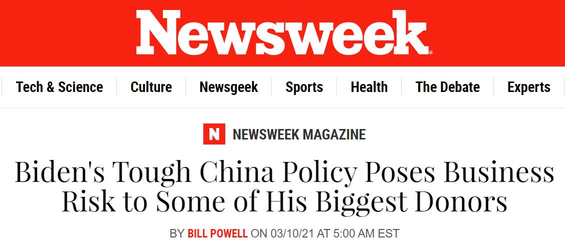 在10日,美国《新闻周刊》曾发表《拜登强硬对华政策可能影响他一些大金主的生意》的文章。