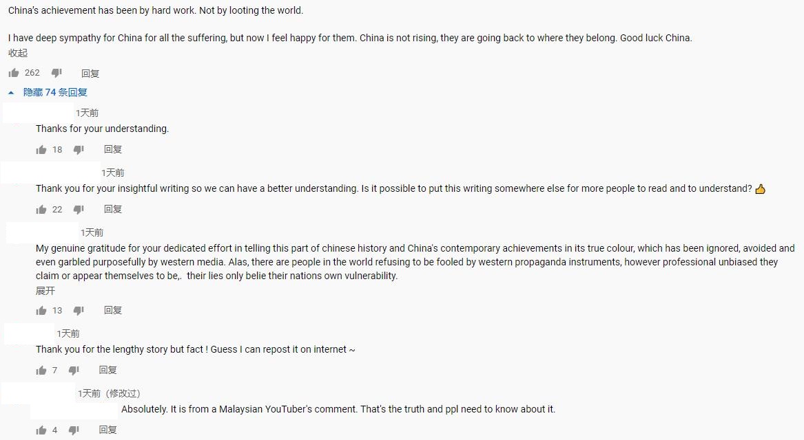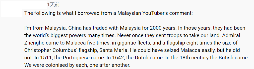 在众多的评论中,有一条转述马来西亚人的评论,通过一段历史事实陈述了中国和平外交的观念。