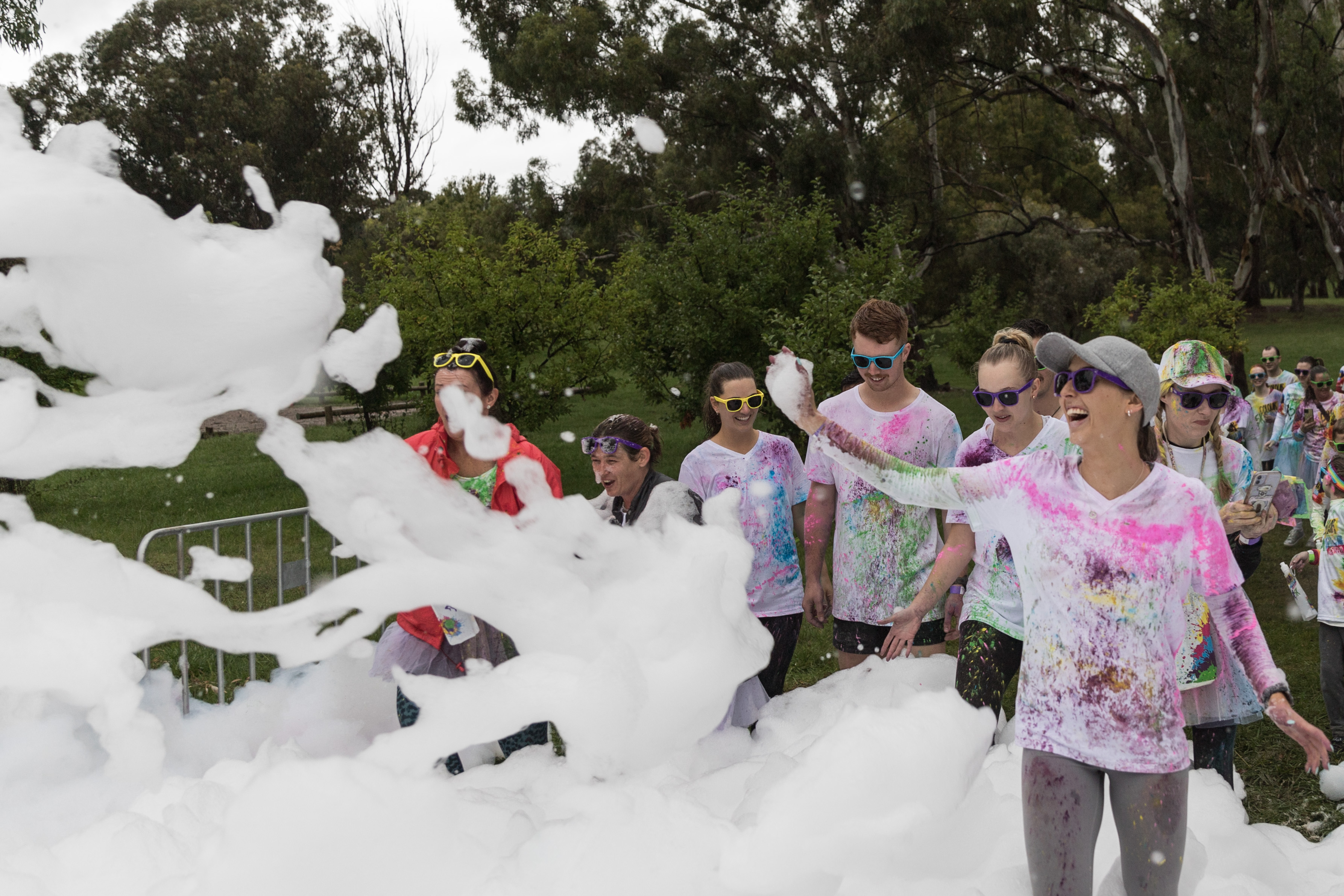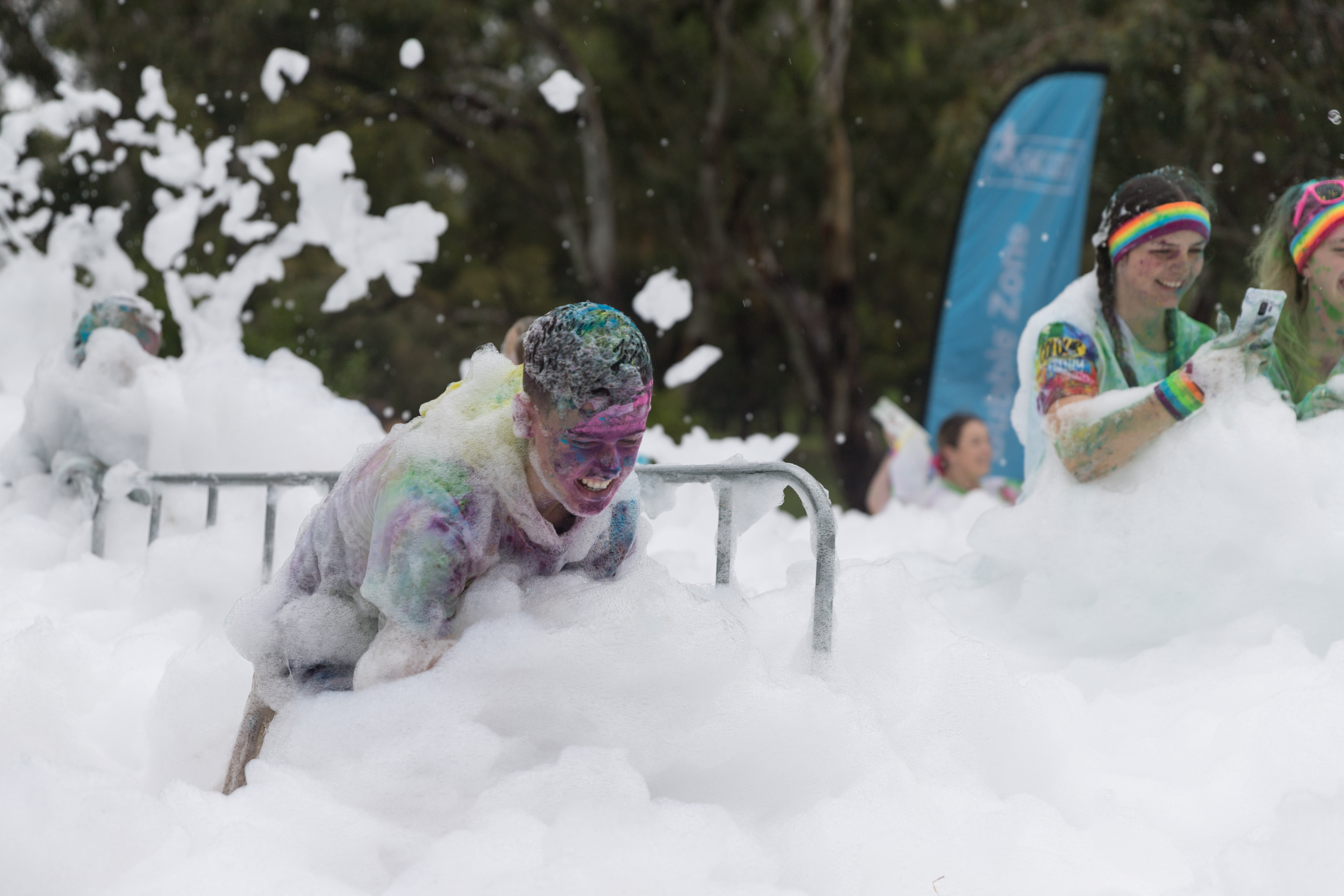 3月21日,参加澳大利亚堪培拉“彩色跑”的人们在泡沫中玩耍。新华社发(刘畅畅摄)
