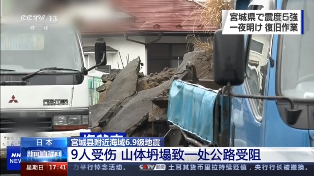在宫城县盐釜市,20日的地震造成当地一公路附近山体发生坍塌,当时停在附近的一辆汽车内的车载记录仪拍到了这一瞬间。