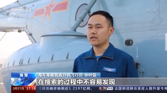 海军某舰载直升机飞行员 孙叶磊:目标比较小,被海浪所掩盖,在搜索的过程中不容易被发现,救护员在救护过程中被海浪影响比较大,造成目标丢失,或者不容易打捞。