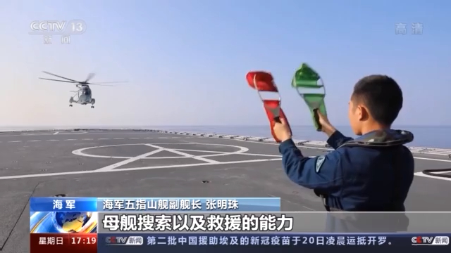 海军五指山舰副舰长 张明珠:海面比较大,不管是母舰还是直升机,搜索的范围都比较大,搜索比较困难。通过此次演练我们提高了母舰搜索以及救援能力,另外提升了母舰与直升机协同搜救的能力。
