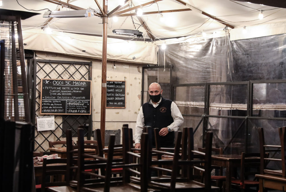 2020年10月26日,意大利首都罗马鲜花广场上一家餐馆在临近18时准备打烊。为加强新冠疫情防控,意大利政府要求自10月26日零时起至11月24日,意大利禁止酒吧、咖啡馆、餐厅、冰淇淋店等每天18时后继续提供堂食。(新华社记者程婷婷摄)
