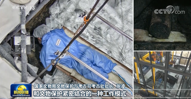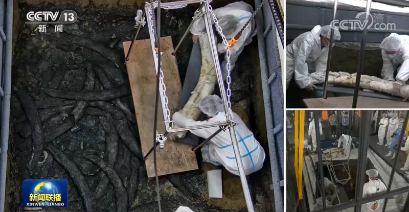 这个神秘的木箱长约1.5米、宽约0.4米,至今未发现盖板,整体碳化,质地非常脆弱。同时,本次考古中发现的最大体量青铜尊今天也成功提取。3号坑大口尊连同内部填土重达几百公斤,在穿上考古队为它量身3D打印的“保护箱”,利用新开发的文物起吊设备成功提取出土。此次发掘,考古队已经发现了近200枚象牙。专家介绍,出土象牙由于已经埋藏于高湿度的土壤中达3000多年,且在埋藏之前或经历焚烧,提取与保护难度极大。今天,考古人员利用高分子材料加固技术将一根象牙成功提取,并立即送往文物保护修复中心。