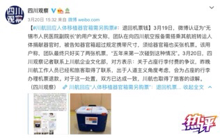 3月19日晚,一位医生发微博称,有医疗团队在乘坐四川航空运送爱心捐献肺源时被要求需另为器官箱购票,“五年来第一次碰到这种情况”。对此,四川航空公司企业文化部一名工作人员3月20日回应称,公司已于19日晚联系上当事乘客并解释情况,决定将该乘客为器官箱运输另购的机票费用予以退还。