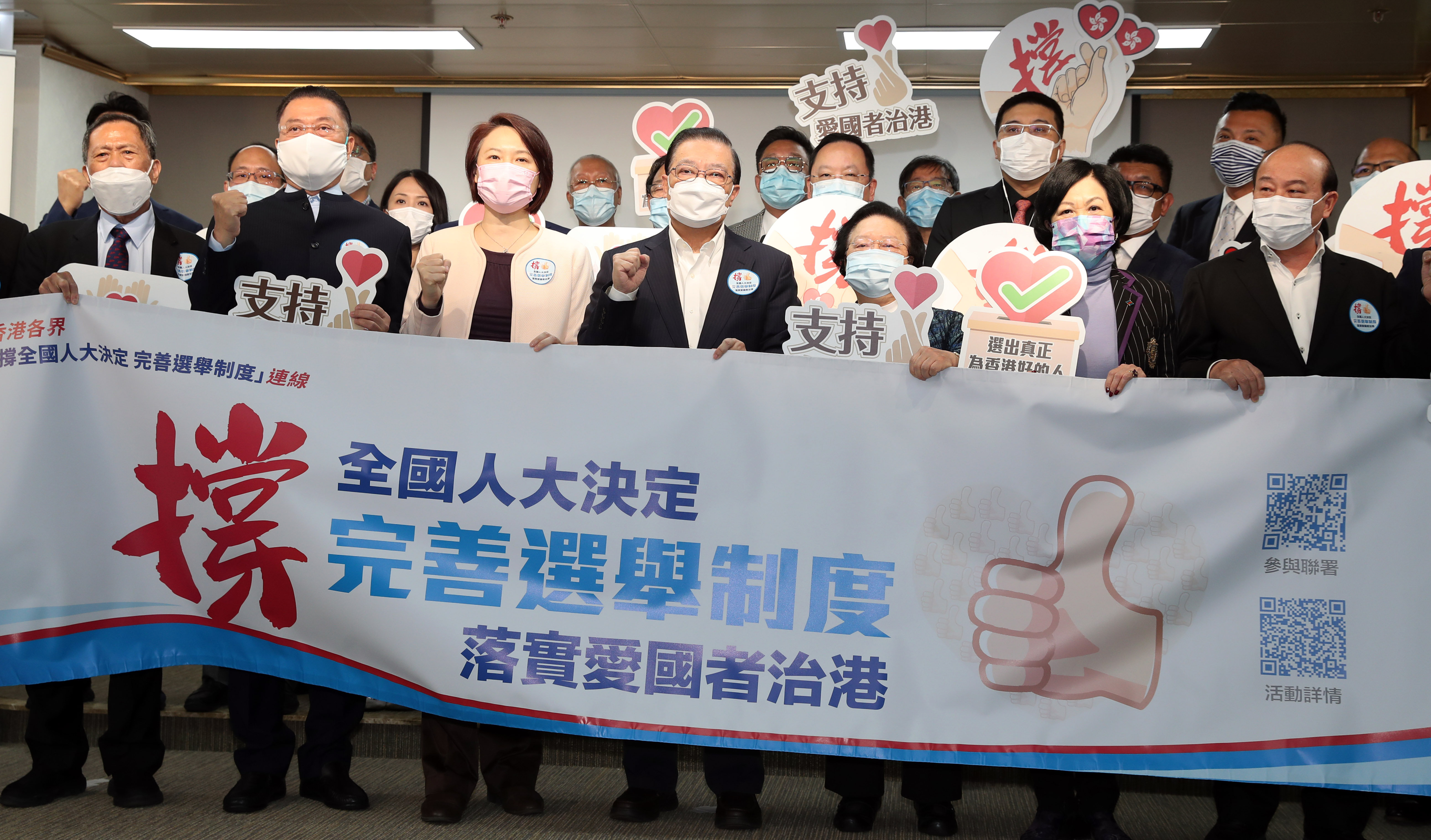 香港工联会会长吴秋北、香港经民联主席卢伟国、香港广东社团总会主席龚俊龙、香港福建社团联会主席吴换炎等均表示,将坚定支持全国人大完善香港选举制度的决定,让“一国两制”行稳致远,令香港长治久安。