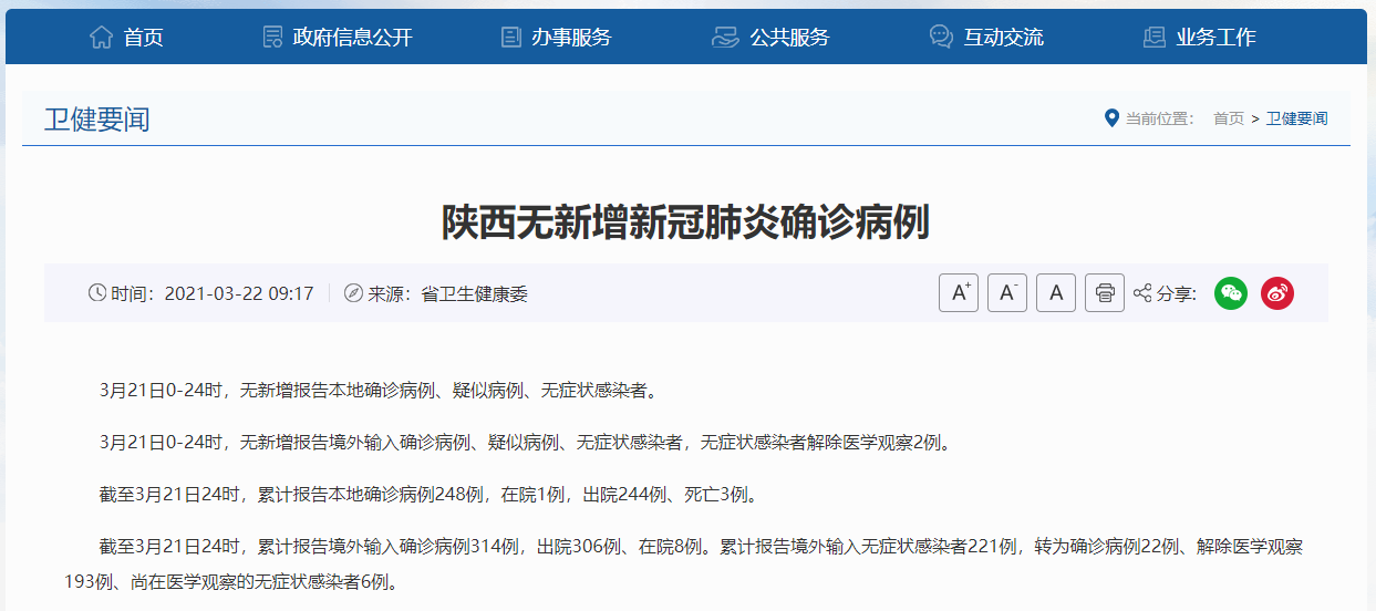 3月21日0—24时,陕西无新增报告境外输入确诊病例、疑似病例、无症状感染者,无症状感染者解除医学观察2例。