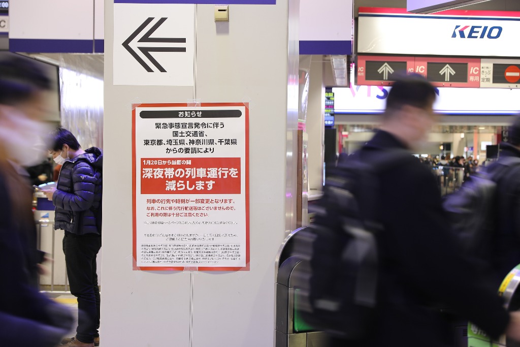 1月22日,在日本东京新宿车站,人们走过一张写有深夜运行班次减少等内容的告示。(新华社记者杜潇逸摄)