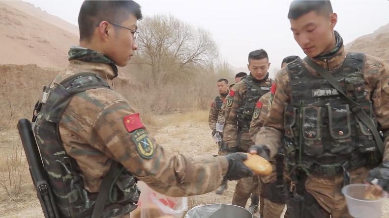 近日,正在野外训练的武警新疆总队吐鲁番支队官兵迎来了特殊的客人,附近的维吾尔族村民为他们送来了200个自己做的馕饼,为训练的战士们加油鼓劲。