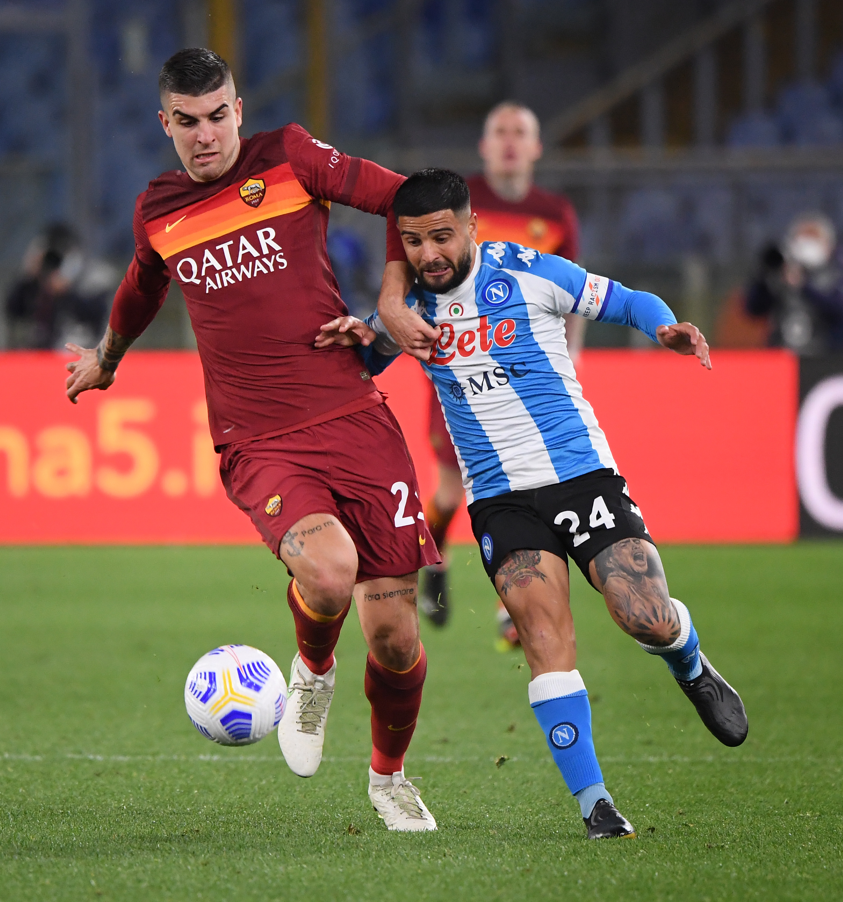 3月21日,那不勒斯队球员因西涅(右)在比赛中和罗马队球员詹卢卡·曼奇尼拼抢。新华社发(阿尔贝托·林格利亚 摄)