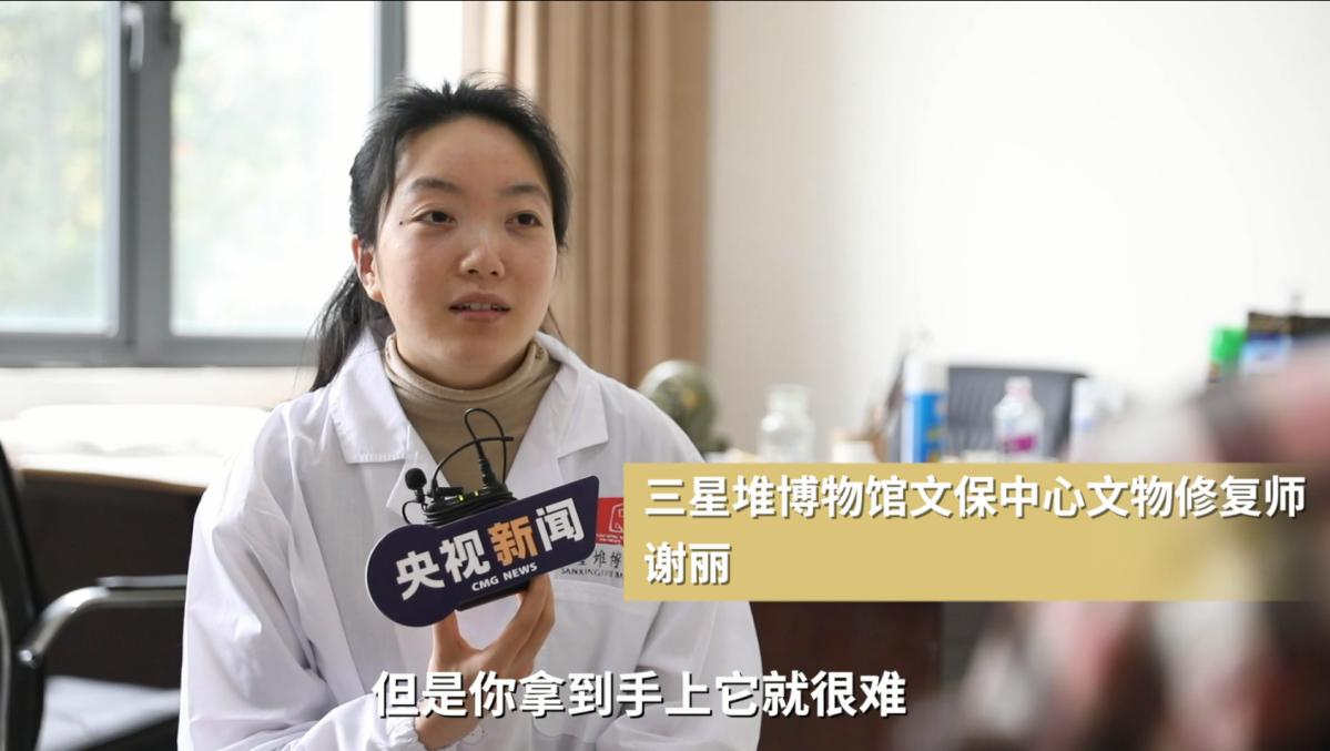 “青铜大立人是断成两截,被人为敲碎了,断成两截,那么青铜大立人的下半部分,就是下面已经在坑里面(被)氧化得比较厉害了。它已经禁不起这个青铜大立人的重量了,那么我们在修复的时候,就要在竖面下面进行加固。也是经过很多次的修复把这个青铜大立人给修起来了。”