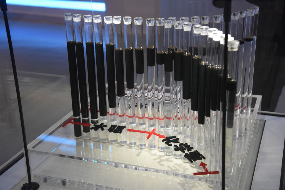 在大庆油田勘探开发研究院采收率研究室一排试管中,油与水的比例随着标注的开采时间逐渐变化,从开发初期几乎全是油,到如今水上只漂着一点“油花”,石油开采难度递增一目了然。