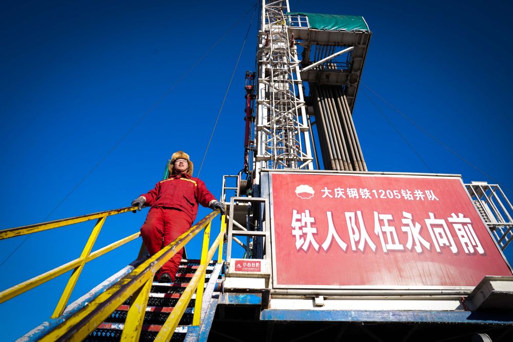 大庆油田1205钻井队钻井工人在野外钻井平台作业。(新华社记者王松2021年1月7日摄)