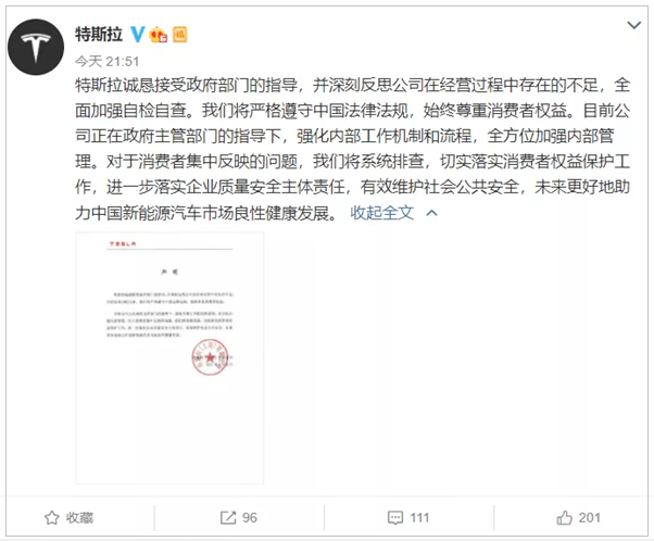 有维权车主说,如果特斯拉对消费者的反馈有这么迅速,态度这么诚恳,就没这么多麻烦事了。