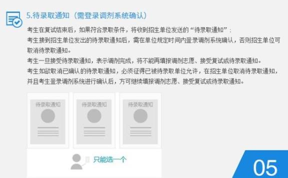 考生只能接受一个调剂志愿的待录取,一旦接受待录取通知,表示调剂完成,将不能再填报调剂志愿、接受复试或待录取通知,请慎重选择!