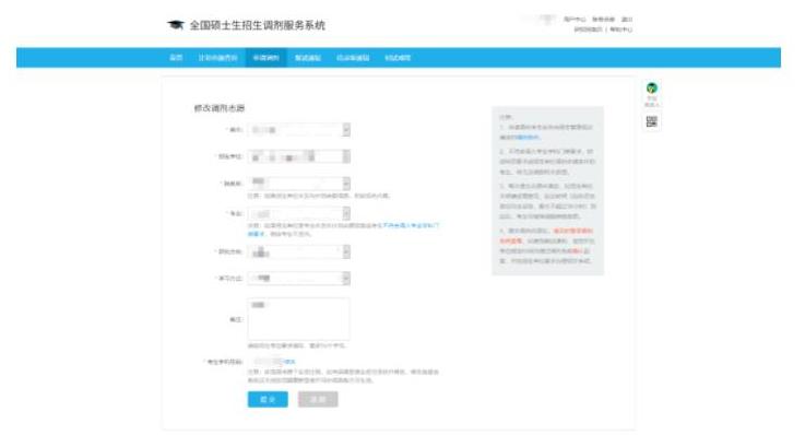 如需修改调剂志愿,可点击“修改”按钮进入修改调剂志愿页面进行修改,修改后点击“提交”按钮即可。