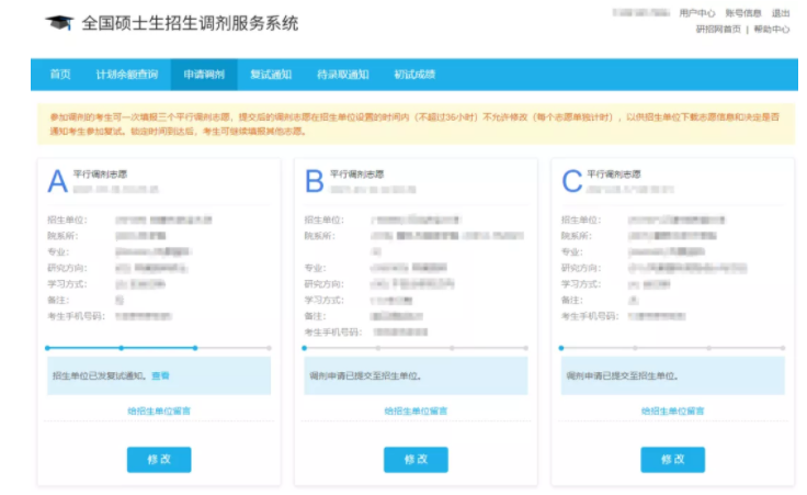 调剂志愿申请提交后,填报院校和其它院校都会看到其三个志愿的进展以及之前复试进展记录。不过不用担心,调剂是双向选择,院校希望有优质生源,同学们也希望能找到心仪院校,老师都理解。