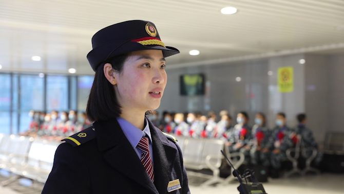 火车站领班 杨琼:为了配合部队做好今年新兵入营接站工作,我们召开了军运专题研究会议。在新兵到站班次增派工作人员,对军人休息室进行扩容,开辟军人绿色出站通道,尽最大努力为官兵们做好运输服务,保障好新兵入伍。