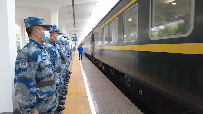 列车缓缓驶入站台,在车站工作人员的协助下,新兵班长们有序引导新战士下车列队。
