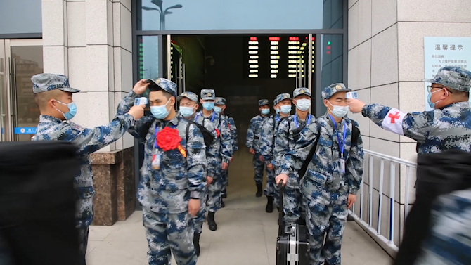 简单休息调整后,新兵们通过军人绿色通道有序出站。根据防疫要求,卫生员为他们逐个测量体温,准备登车返回营区。
