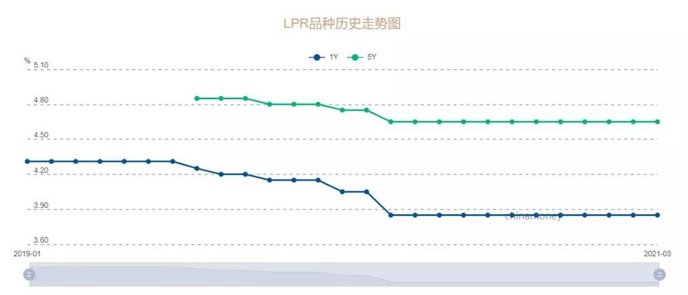 中国人民银行授权全国银行间同业拆借中心公布,2021年3月22日贷款市场报价利率(LPR)为:1年期LPR为3.85%,5年期以上LPR为4.65%。以上LPR在下一次发布LPR之前有效。至此LPR已连续11个月不变。