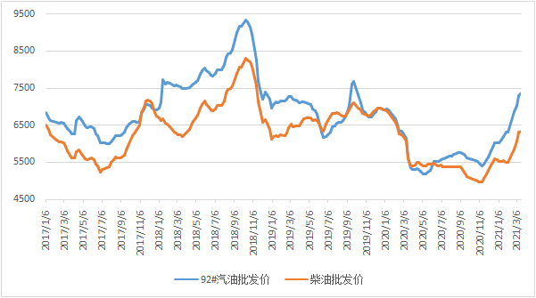 图表:中国汽柴油批发价格周度均价走势图(单位:元/吨)