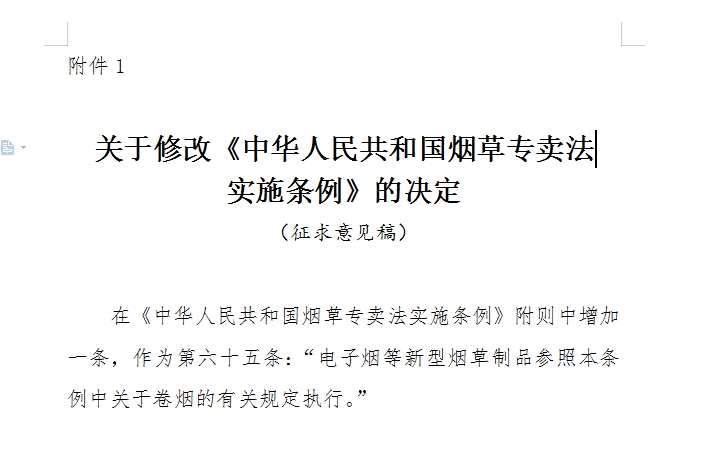 据工信部官网消息,工信部近日发布了《关于修改《中华人民共和国烟草专卖法实施条例》的决定(征求意见稿) 》,决定在《中华人民共和国烟草专卖法实施条例》附则中增加一条,作为第六十五条:“电子烟等新型烟草制品参照本条例中关于卷烟的有关规定执行。”