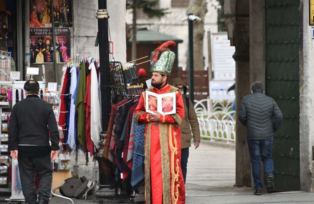 3月16日,土耳其伊斯坦布尔市区一家旅游纪念品商店的营业员在等待顾客。(新华社记者徐速绘摄)