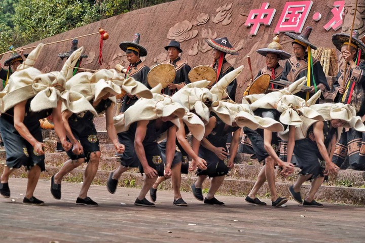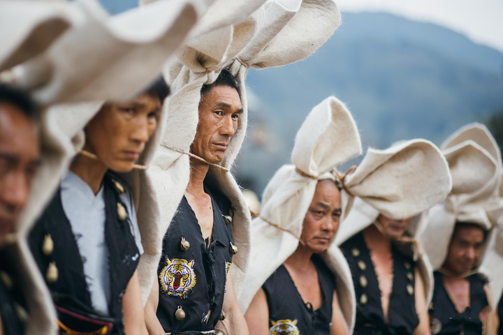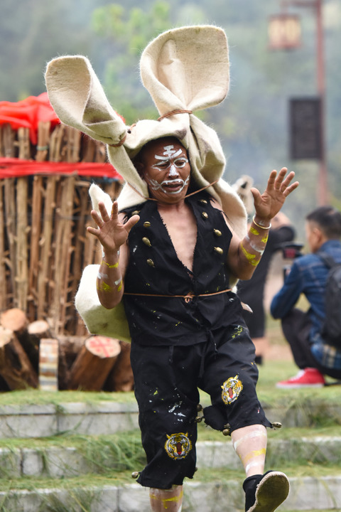 “老虎笙”队首先亮相。18名成年男性个个披上毡装扮为虎,手脚和面部绘上虎纹,在老虎“头领”率领下,表演“老虎耙田”“老虎栽秧”等与生产劳作相关的一套舞蹈动作。