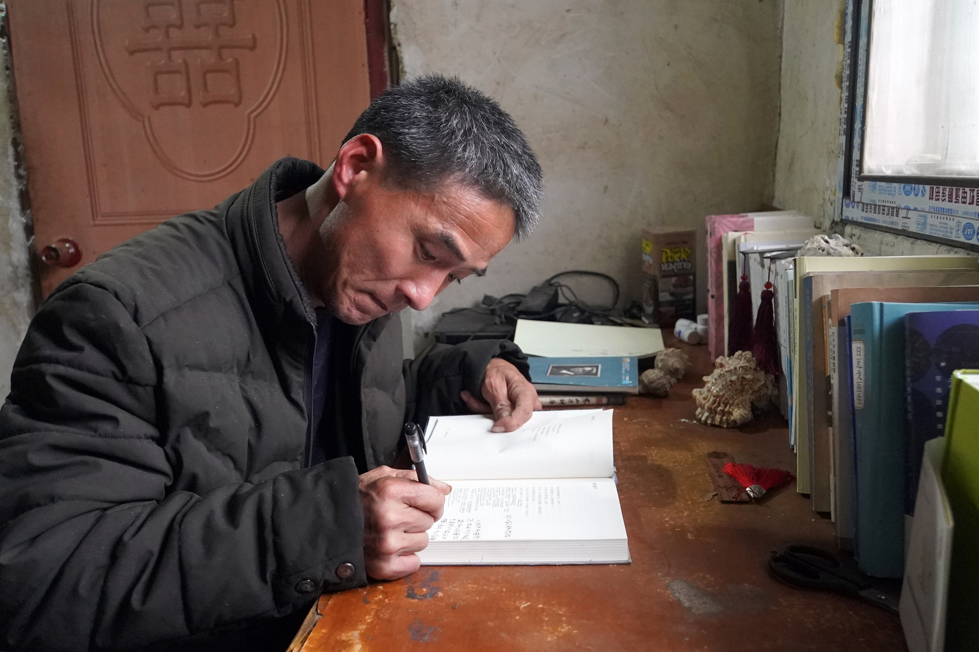 李松山在家中读书时,将灵感随时记录在书页上。新华社记者 袁月明 摄