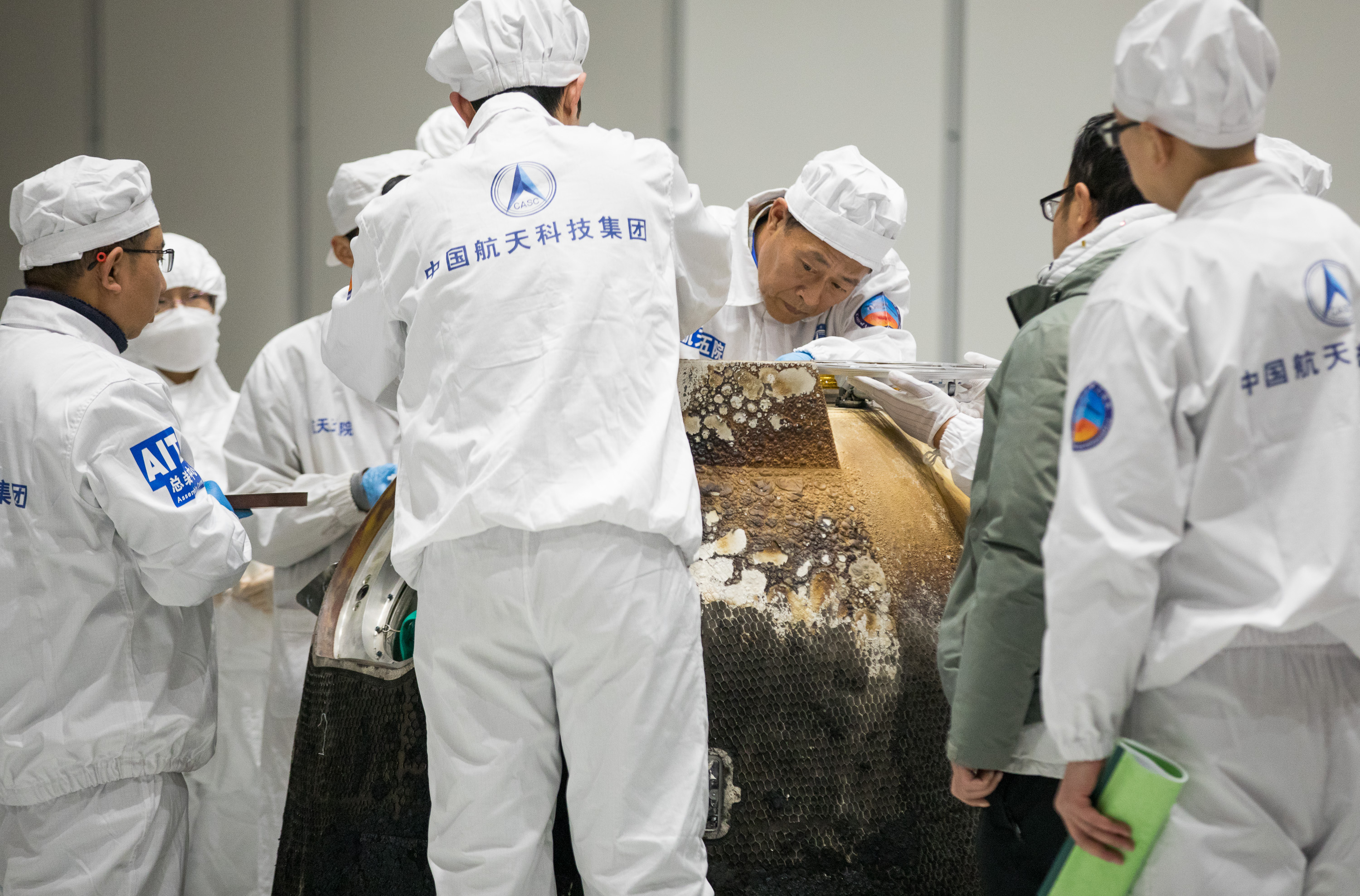2020年12月17日,在中国航天科技集团五院,科研人员打开嫦娥五号返回器舱门,取出装有月球样品的容器并进行称重。新华社记者 金立旺 摄