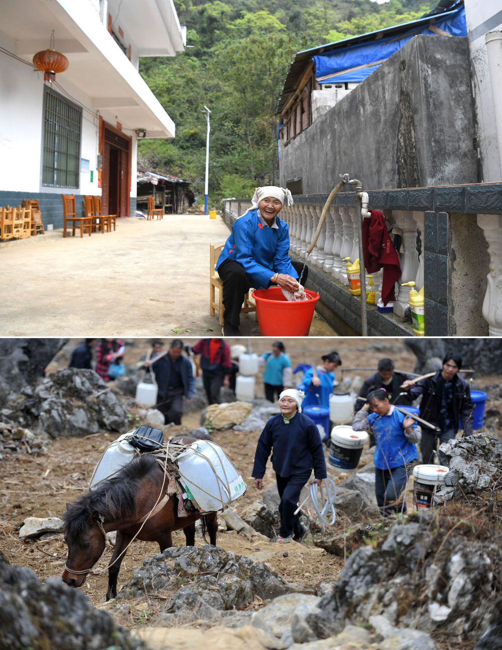 ↑ 拼版照片:上图为广西那坡县龙合乡明浪村弄蓬屯村民韦秀海用自来水洗衣服(2021年3月10日摄);下图为2010年3月29日,韦秀海(前左一)赶着马和其他村民一起行走在取水的山间小路上。