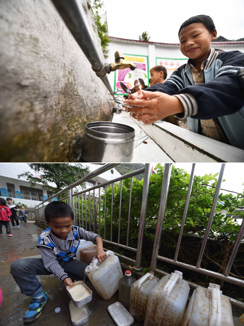 ↑ 拼版照片:上图为广西大化瑶族自治县板升乡八好小学学生用泉水洗碗(2021年3月16日摄);下图为2014年11月24日,八好小学学生用储备在水桶里的雨水淘米煮饭。八好小学有400多名学生,曾仅有一个不足100立方米的水柜,用于收集储存雨水,学生需定时定量用水。遇到长时间不下雨,学校就要到乡政府所在地运水。如今,学校修建了5个大水柜,并从两公里外引泉水到校园,“饮水难”问题得到解决。