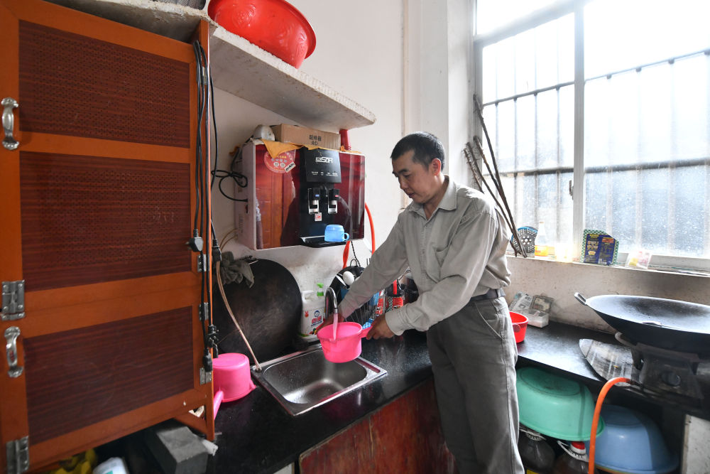 ↑ 在广西大化瑶族自治县江南乡龙凤村岩简移民安置点,村民蒙廷基从水龙头接水(2021年2月6日摄)。