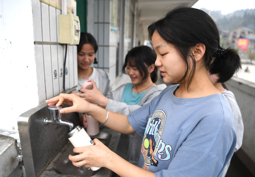 ↑ 几名学生在广西三江侗族自治县独峒镇第二中学学生宿舍楼接直饮水(2021年3月17日摄)。