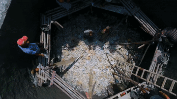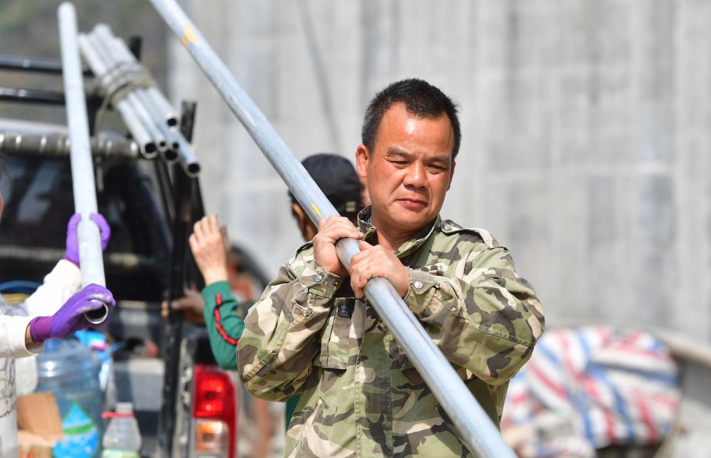 ↑ 在广西大化瑶族自治县板升乡八好村,通水工程的施工人员在搬运水管(2021年2月7日摄)。