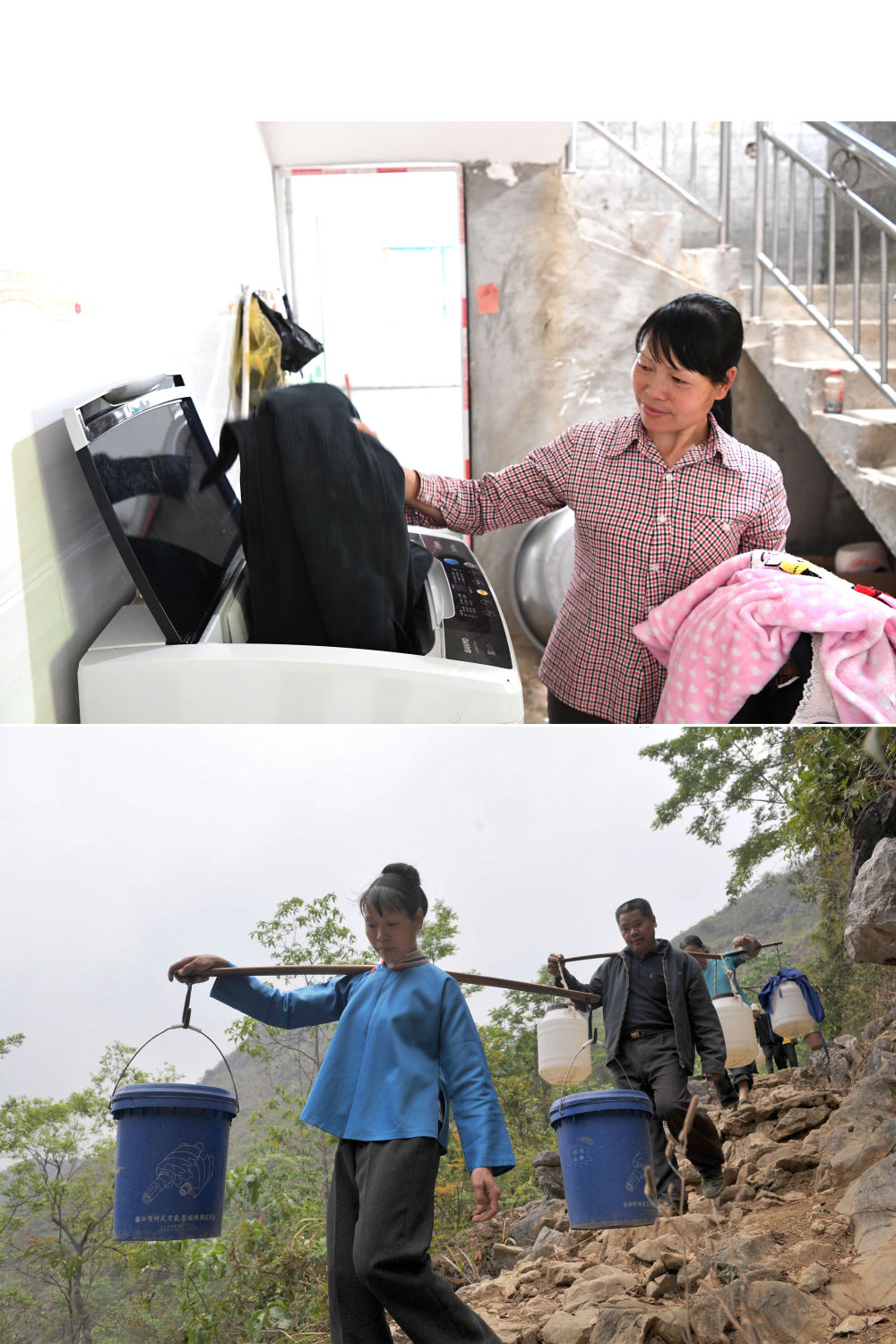 ↑ 拼版照片:上图为广西那坡县龙合乡明浪村弄蓬屯村民周氏涛将衣物放进洗衣机(2021年3月10日摄);下图为2010年3月29日,取水归来的周氏涛(左一)挑着水和其他村民一起行走在山间小路上。自来水进家庭,让昔日用水不便的群众有条件添置了不少新电器。