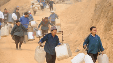 ↑ 广西那坡县龙合乡明浪村弄蓬屯村民用水桶接水(2021年3月10日摄)。