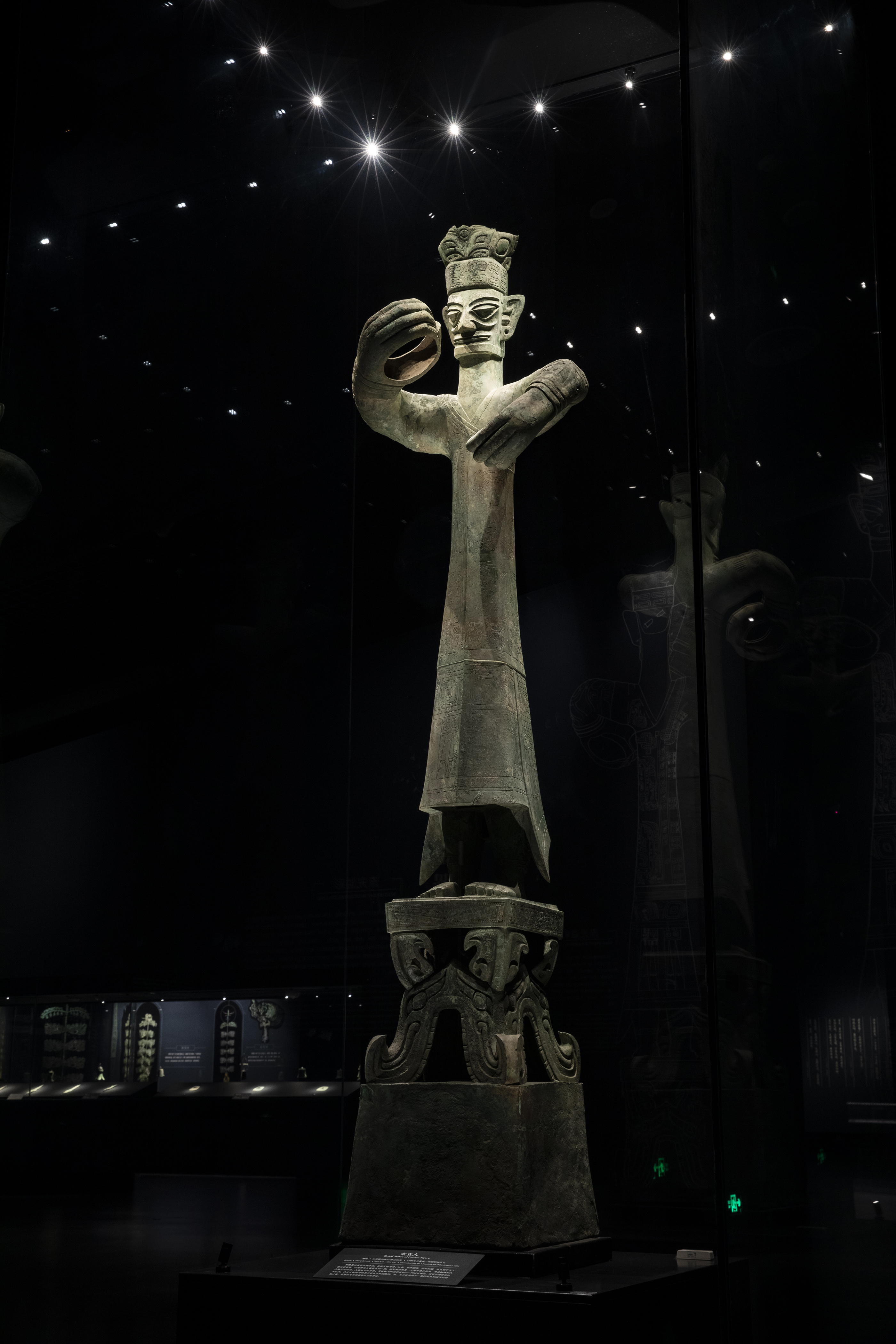 在已发现的三星堆众多青铜雕像中,“青铜大立人”是毫无疑问的“领袖”。“他”头戴高冠,身穿窄袖与半臂式服饰共3层衣服,衣服纹饰繁复精丽,以龙纹为主,辅配鸟纹、虫纹和目纹等,身佩方格纹带饰。有专家认为,“青铜大立人”是一代古蜀王形象,既是君王又是群巫之长“大祭司”。