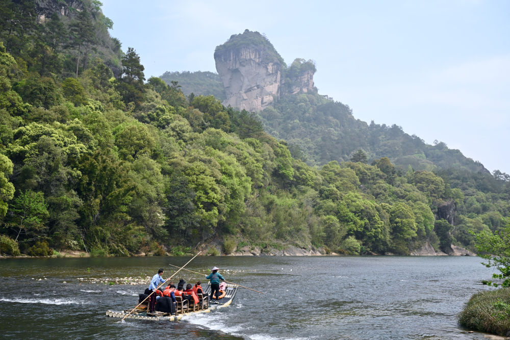 △3月22日,游客在武夷山国家公园九曲溪乘竹筏游览。