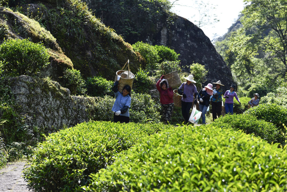 △2020年4月29日,在福建省武夷山岩茶核心产区,工人采茶后返回。