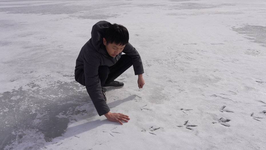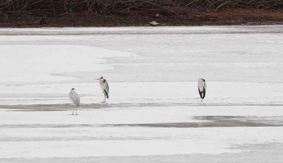 冰面上13只苍鹭在料峭的冰河上时而飞翔盘旋上空,时而落在冰面上觅食,小憩。由于还没有开河,苍鹭觅食非常困难。为了让迁徙归来的苍鹭能够吃饱,当地野生动物疫源疫病监测站的工作人员们想尽了办法。