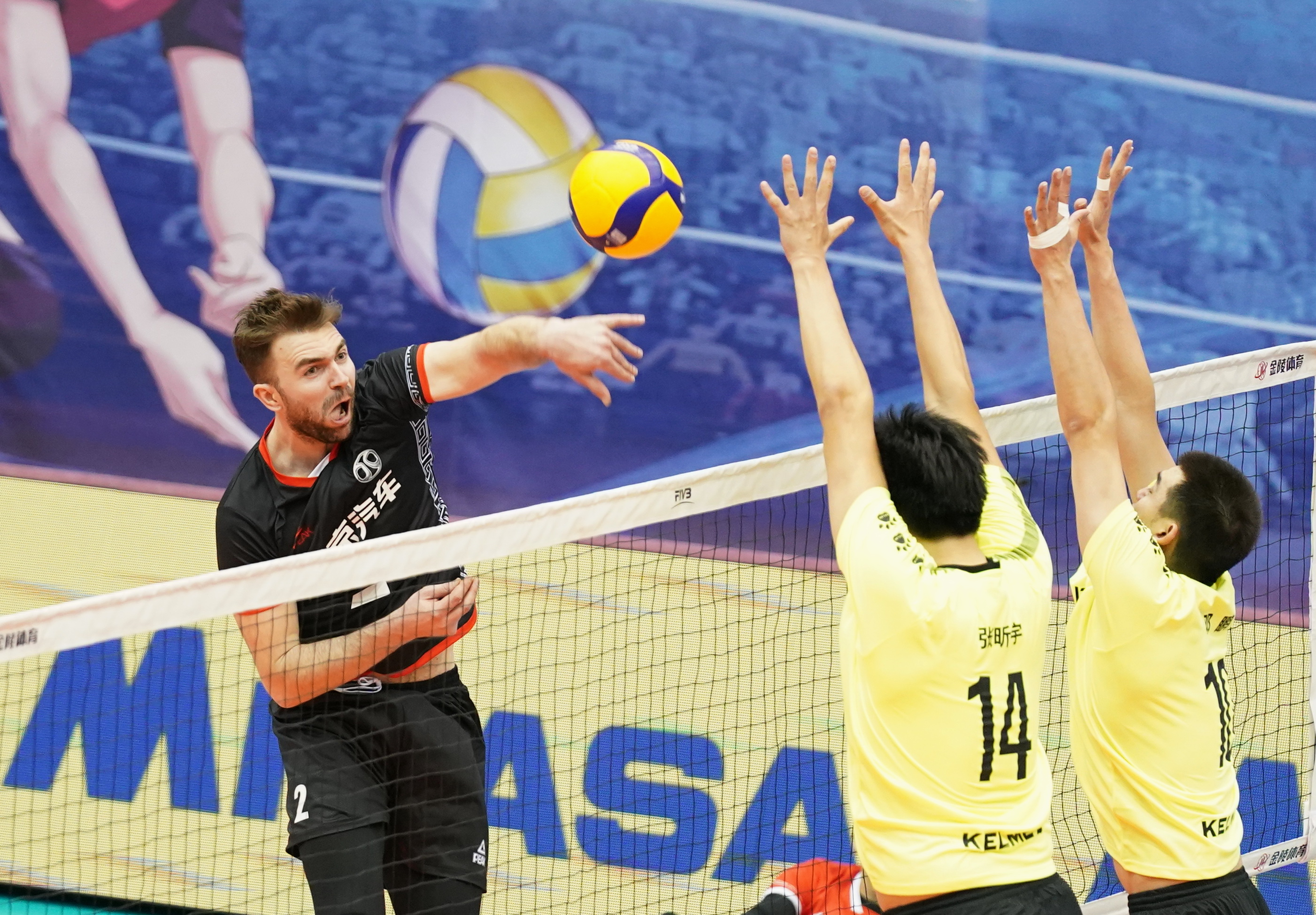 3月22日,北京队球员科瓦切维奇(左)在比赛中扣球。新华社记者杨世尧摄