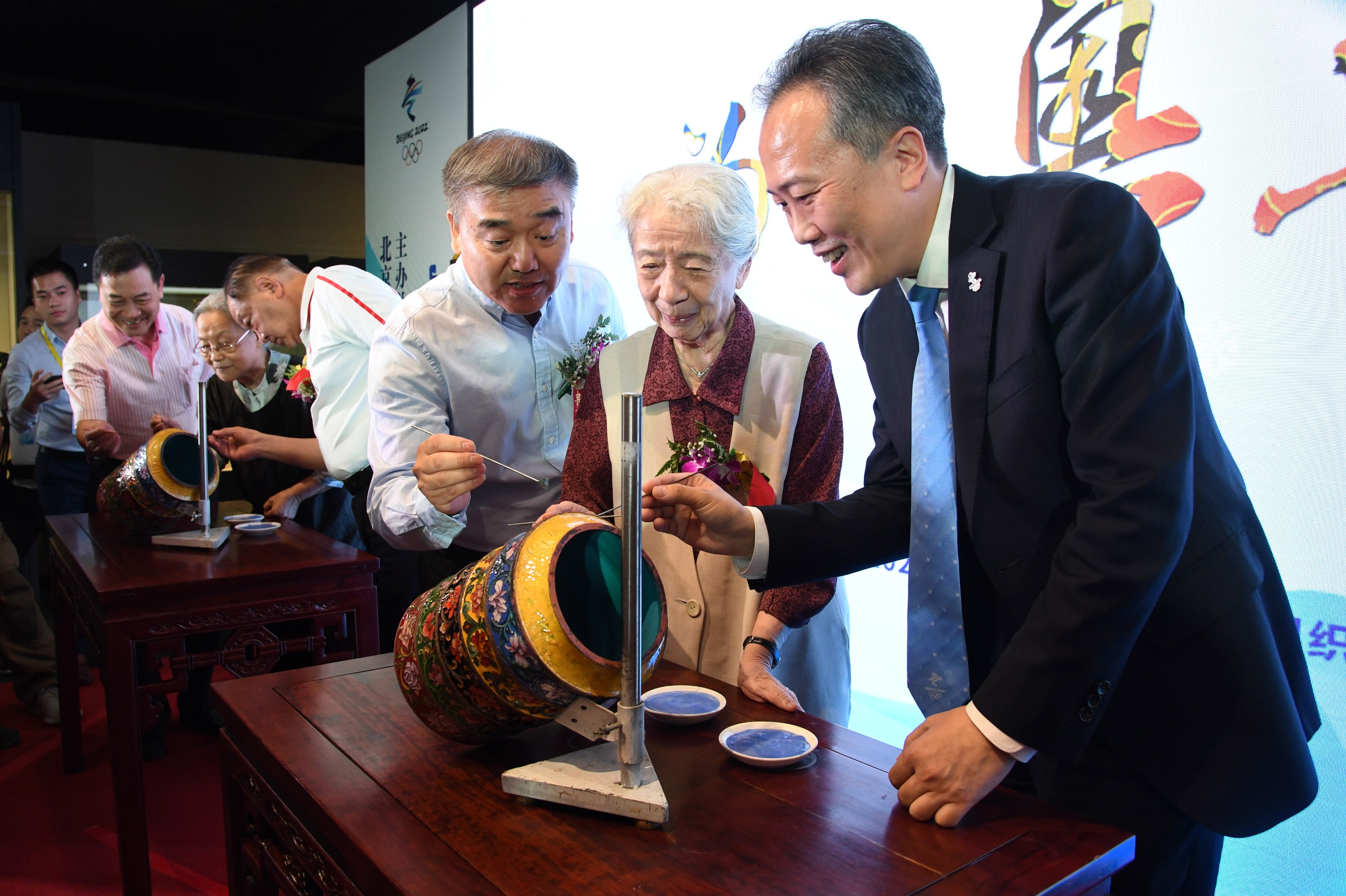2020年9月9日,北京冬奥会特许商品“冬奥五环珐琅尊”发布,北京冬奥组委市场开发部部长朴学东(右一)、原中央工艺美术学院院长常沙娜(右二)和国家非物质文化遗产景泰蓝技艺代表性传承人钟连盛(右三)在发布会“为冬奥点蓝”仪式上。新华社记者任超摄