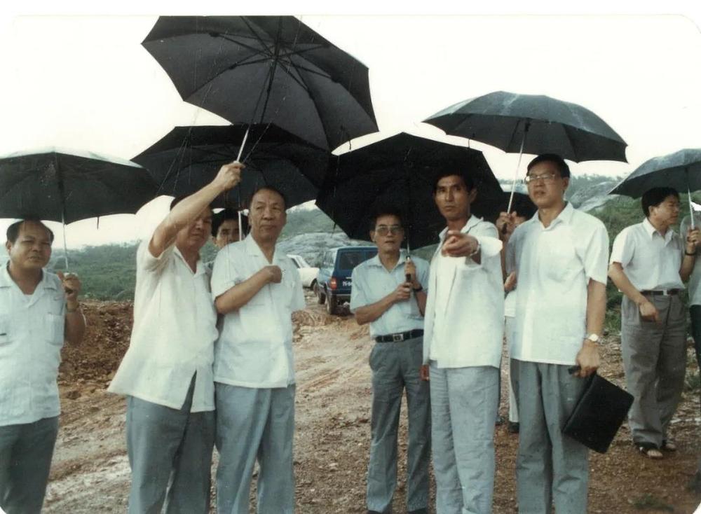 雨中的彭士禄在大亚湾工地现场。