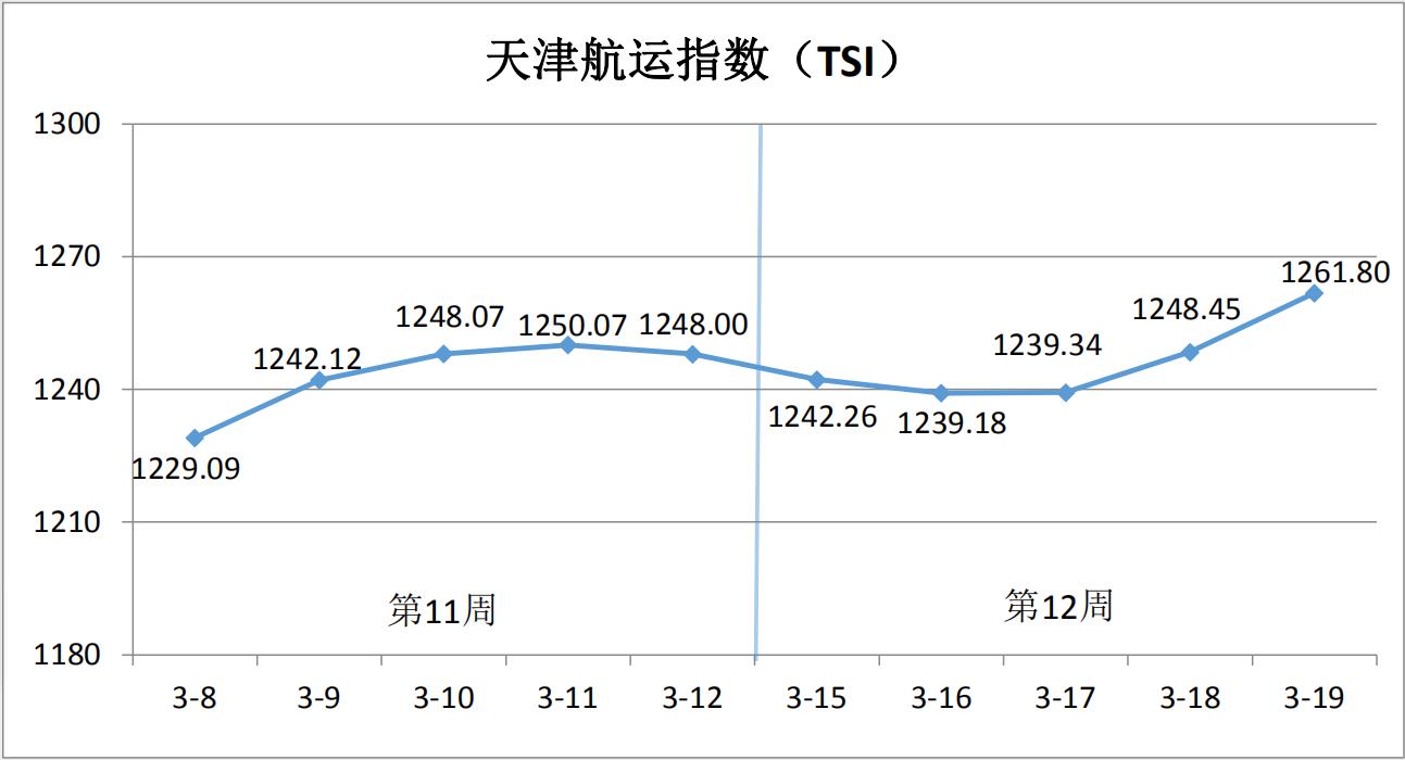 新华社天津3月23日电(记者王宁)记者从天津国际贸易与航运服务中心获悉,2021年第12周(3月15日-19日),中国北方内外贸海运价格的风向标——天津航运指数(TSI)收于1261.80点,相比3月12日(第11周最后一个发布日)累计上涨1.11%。