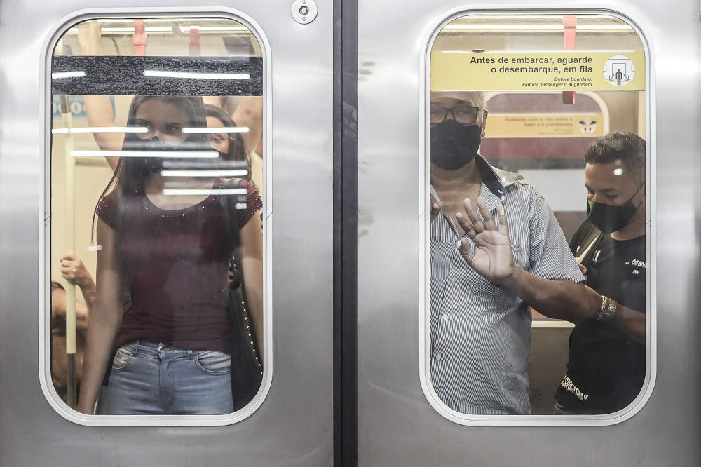 3月22日,人们戴口罩在巴西圣保罗乘坐地铁。新华社发