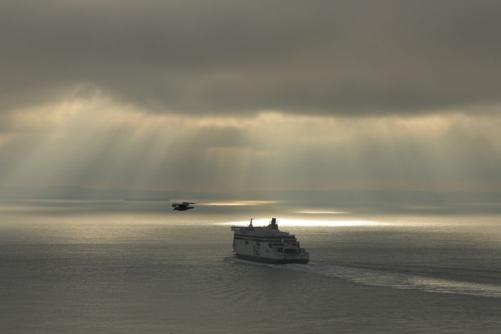 1月1日,一艘轮船驶离英国多佛港。多佛港是距离欧洲大陆最近的英国港口。(新华社发,蒂姆·爱尔兰摄)