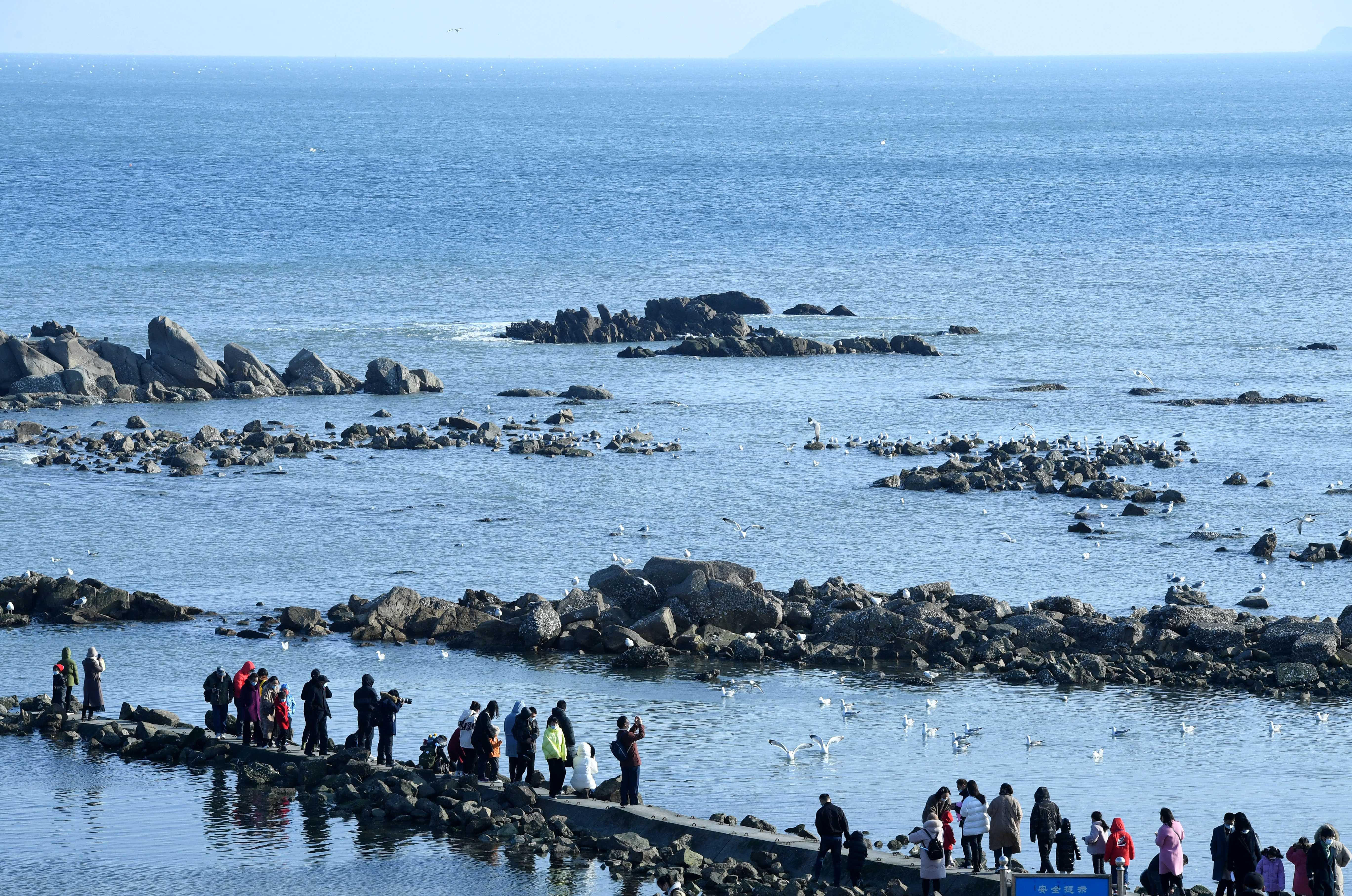 2月15日,游客在青岛市麦岛附近海边游玩。新华社记者 李紫恒 摄